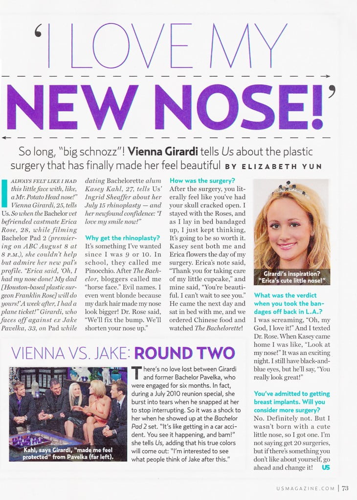 Bachelor Winner Vienna’s Nose Job by Dr. Franklin Rose in US Magazine